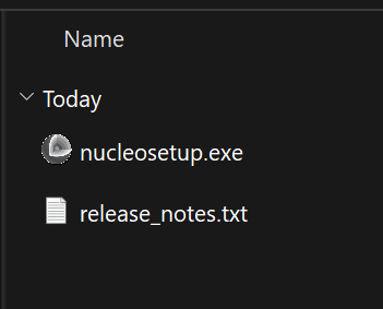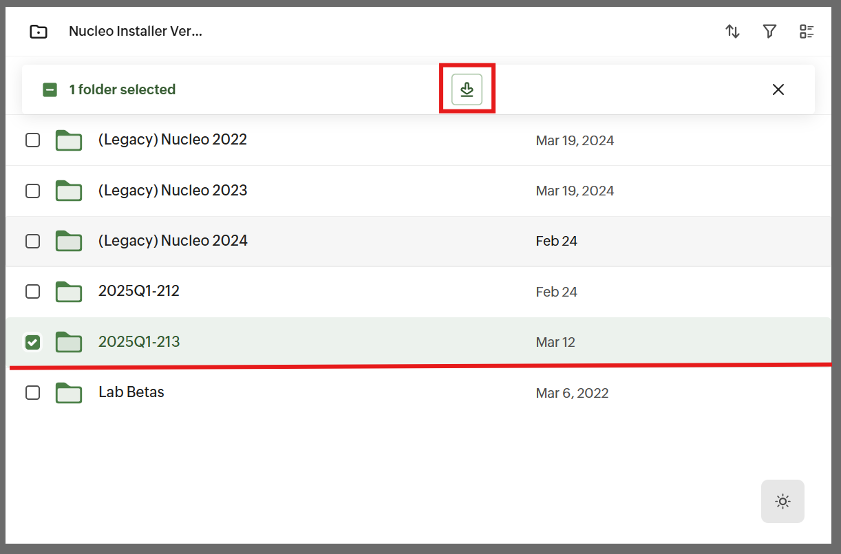 Scroll Down to the Nucleo Installer Versions Section and you will need to download the current release. It will be the 2025Q1-??? folder where the "???" represents the current release. check the box on the file and then press the Green Arrow to download