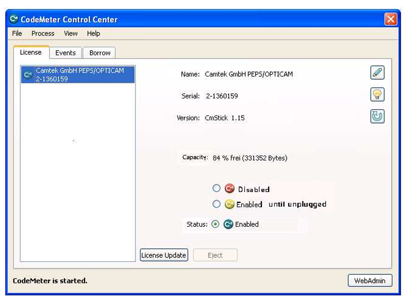 9) You will be sent a password file to activate your software. Please keep in mind that these passwords are generated from Camtek Germany so please remember the six-hour time difference. When you receive the new file back, please open it on the computer where the OPTICAM dongle is connected with the "Default Application". It will prompt you to load the contents of the file into the CodeMeter dongle, and once successful, the license will be updated.